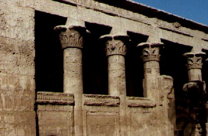 An der Vorderfrond des Tempels befinden sich zwischen den einzelnen Säulen Szenen, die den König mit verschiedenen Götter zeigen. Auf der Abbildung wird über dem König das Anchzeichen als Form für das ewige Leben aus-gegossen. Gleichzeitig soll damit das ewige Königstum über Ägypten dargestellt werden.